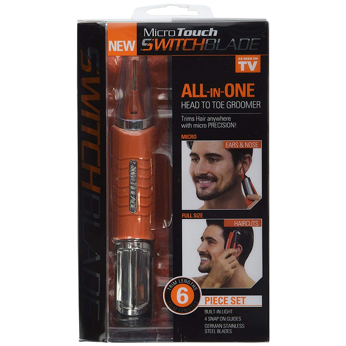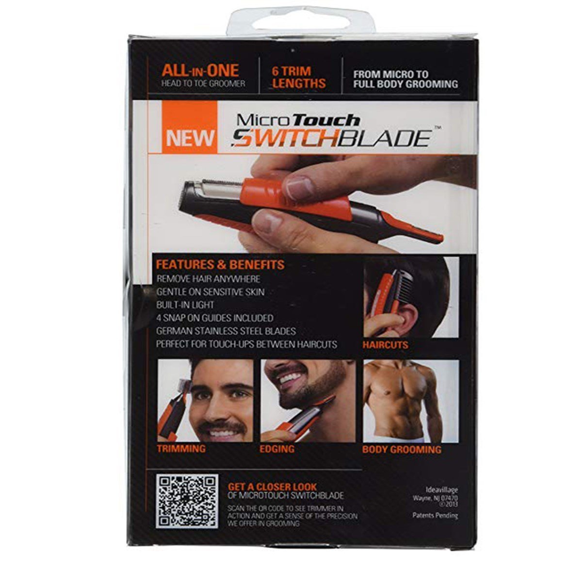 Vücut kıllarını, sakalları ve baş kıllarını düzeltebilirsiniz. Kit, dahili hafif, 4 geçmeli kılavuz ve Alman paslanmaz çelik bıçaklarla birlikte Microtouch Switchblade (4 tarak ataşmanı, mikro düzeltici başlığı, tam boyutlu düzeltici kafası ve koruyucu başlık içerir) ile birlikte gelir.