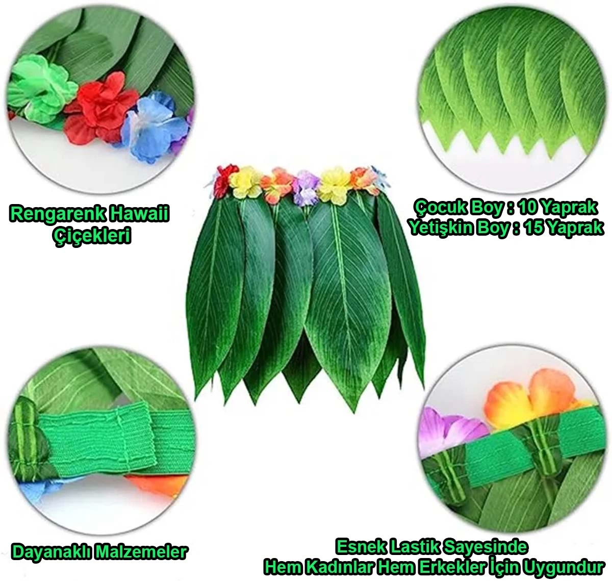 Doğal görünümlü yapay yapraklardan&nbspözenle hazırlanan bu etek, tropikal temalı etkinlikleriniz, partileriniz veya özel günleriniz için mükemmel bir seçim. İster Hawai temalı bir doğum günü kutlaması, ister yaz partisi, ister kostüm balosu olsun, bu etek ile tüm dikkatleri üzerinize çekeceksiniz.